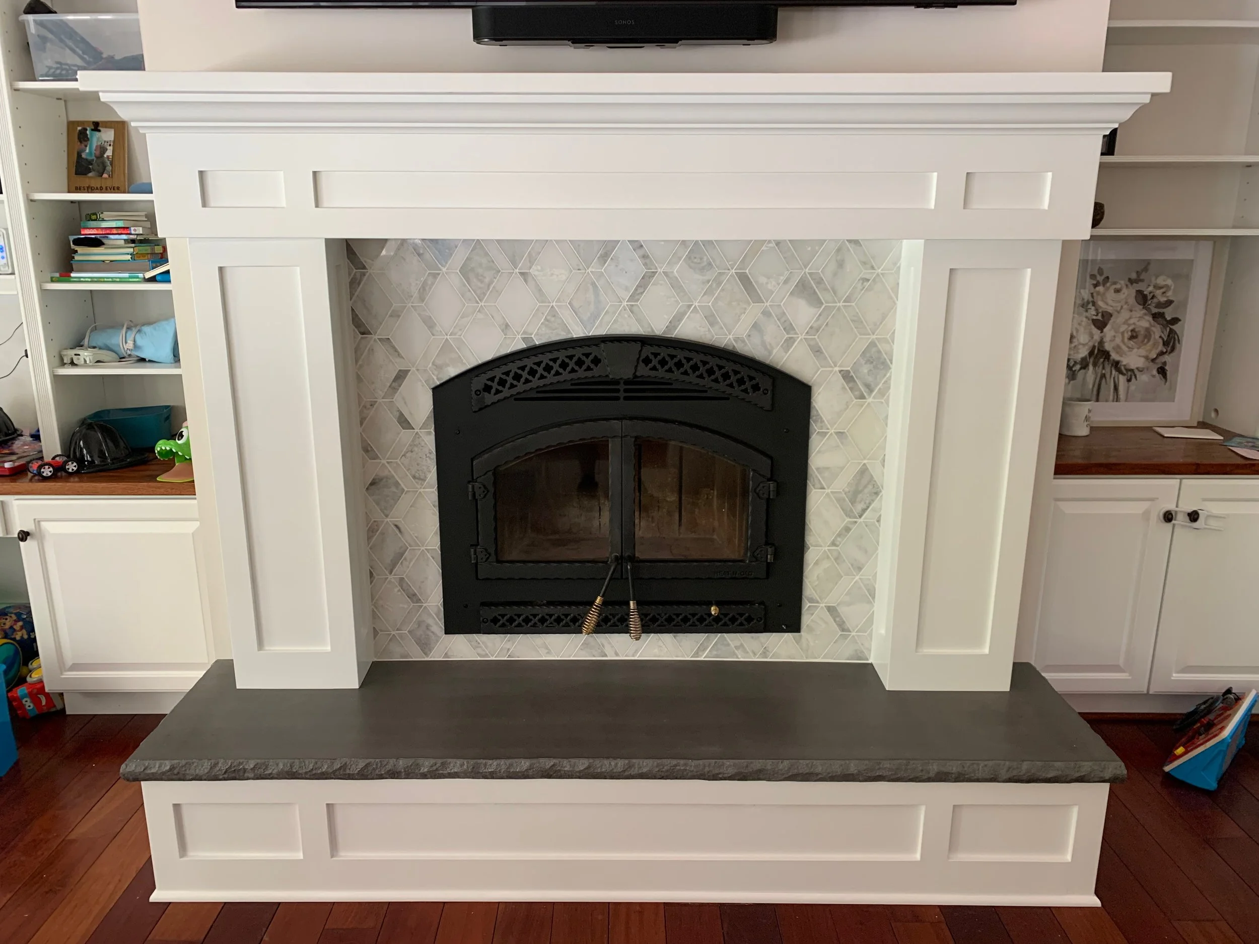 Mission Style White Fireplace w/ Carrara Tile & Custom Poured Concrete Hearth